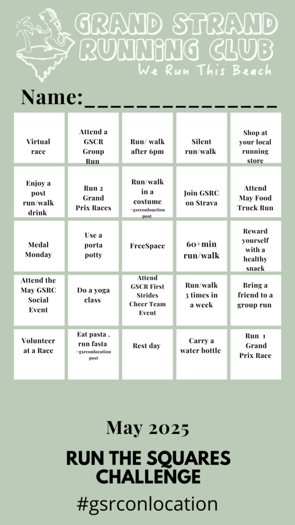Return your squares board by the last day of the month to Fleet Feet Myrtle Beach or Black Dog Running Company